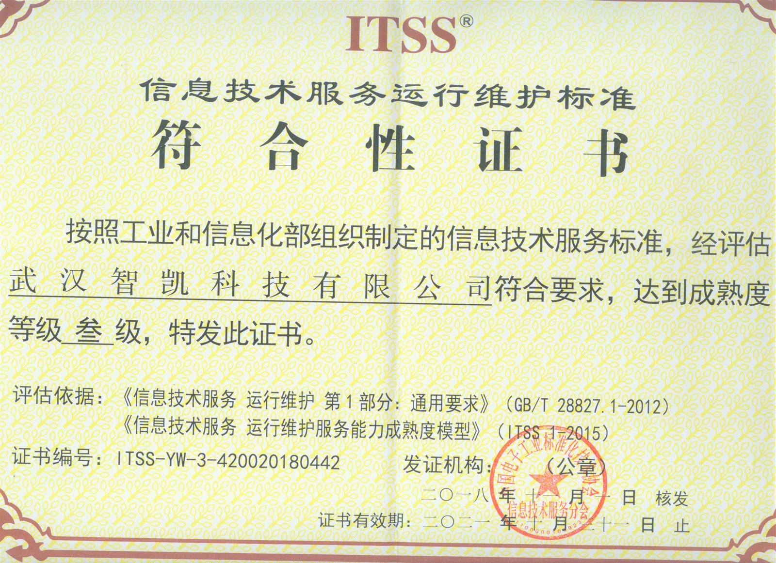 2018年武汉智凯科技有限公司通过了工信部中国电子工业标准化技术协会ITSS 3 运行维护服务能力成熟度模型三级认证。此项认证通过,标志着武汉智凯科技有限公司具备承接大型项目运维服务能力。