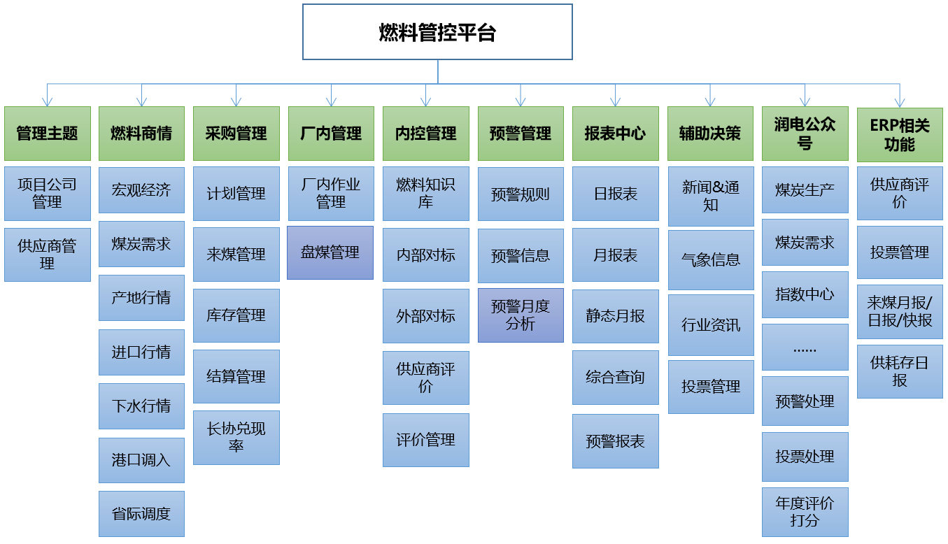 燃料管控平台于2017年启动建设, 2018年8月25日完成一、二期功能上线,范围主要覆盖主题管理、燃料商情、采购管理、厂内管理、内控管理、预警中心、报表中心、辅助决策等,已接入10个大区公司的33个火电项目公司,包括PC端和润电公众号应用,为后续采用信息化手段加强燃料采购全过程精细化管控提供了坚实的基础。