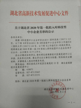 日前,根据《科技型中小企业评价办法》(国科发政【2017】115号,以下称《评价办法》)和《科技型中小企业评价工作指引》(国科火字【2017】144号,以下称《工作指引》)的规定要求,将湖北省2020年第一批350家拟入库科技型中小企业名单予以公示,并于近日我司成功通过公示期。