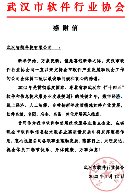 武汉市软件行业协会是唯一代表武汉市软件产业的行业组织。协会在武汉市经济和信息化局的主管下,以服务政府、行业和企业为主要工作内容,并积极开展国内外软件行业的交流与合作,发挥政府与企业之间的桥梁和纽带作用。本次评比旨在评选出对武汉市软件和信息技术产业高发展发挥重要作用的软件企业,能获此殊荣既是对武汉智凯科技有限公司的肯定,更督促武汉智凯科技有限公司在新的一年里乘风破浪,砥砺前行。