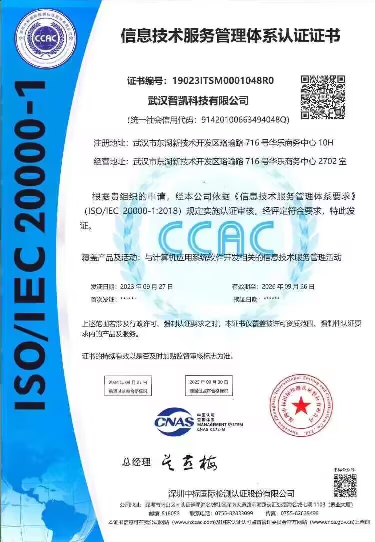 喜讯!武汉智凯科技有限公司顺利通过ISO 20000信息技术服务管理体系认证。