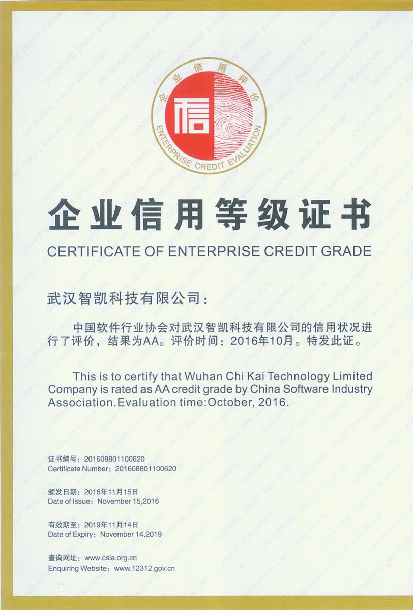 近日,武汉智凯科技有限公司被正式评定为信用等级AA(优良)的高科技软件企业。