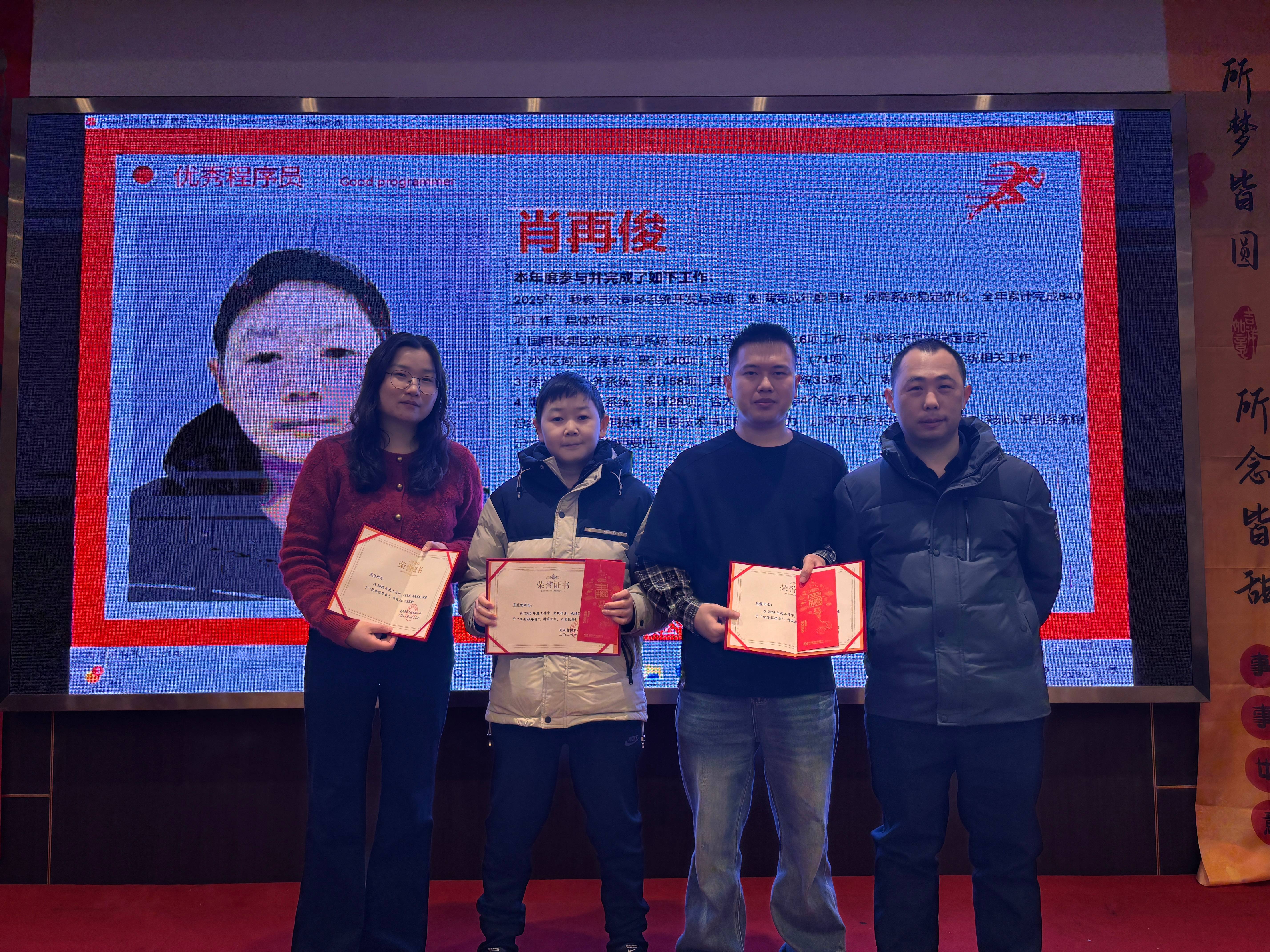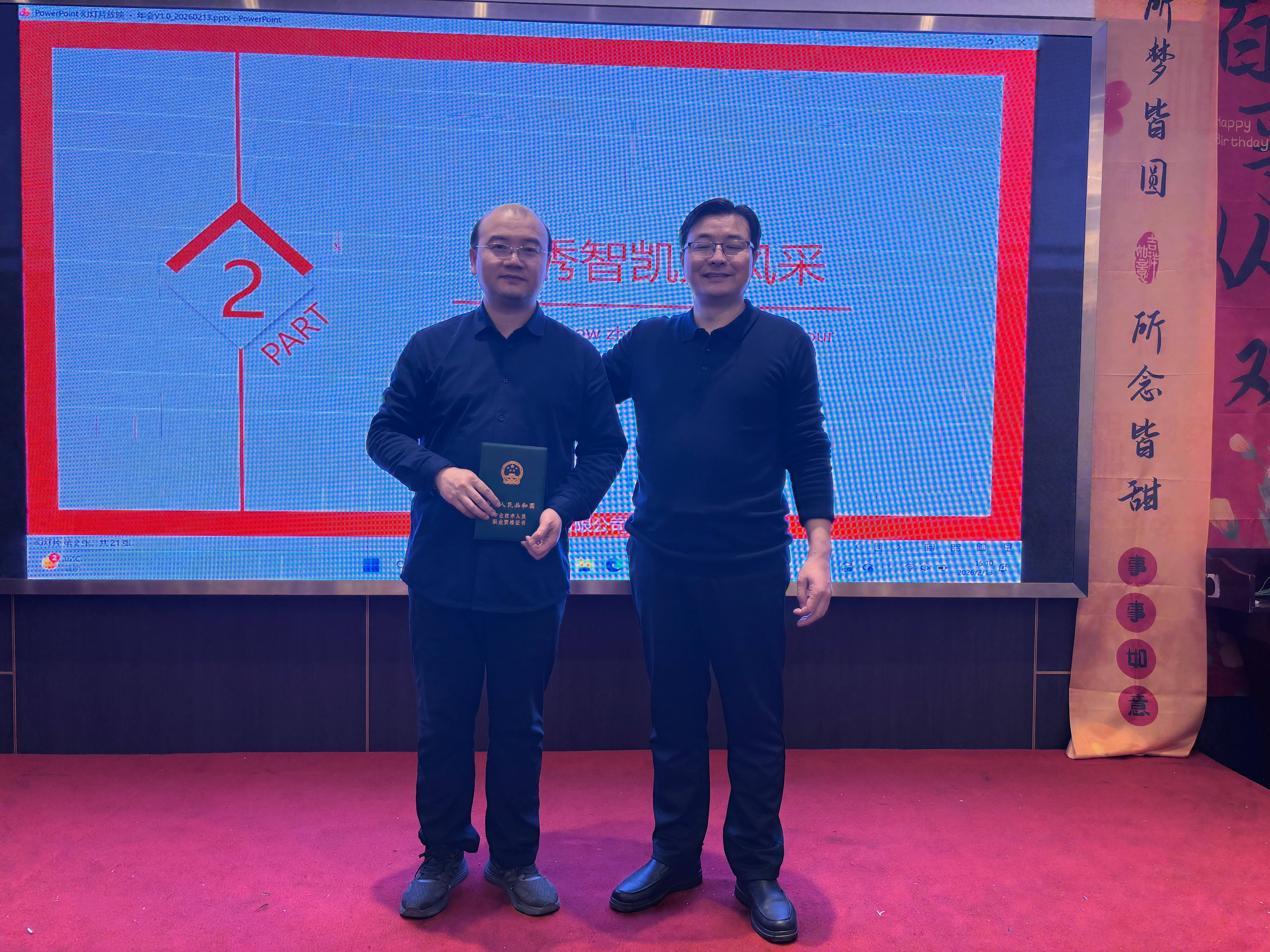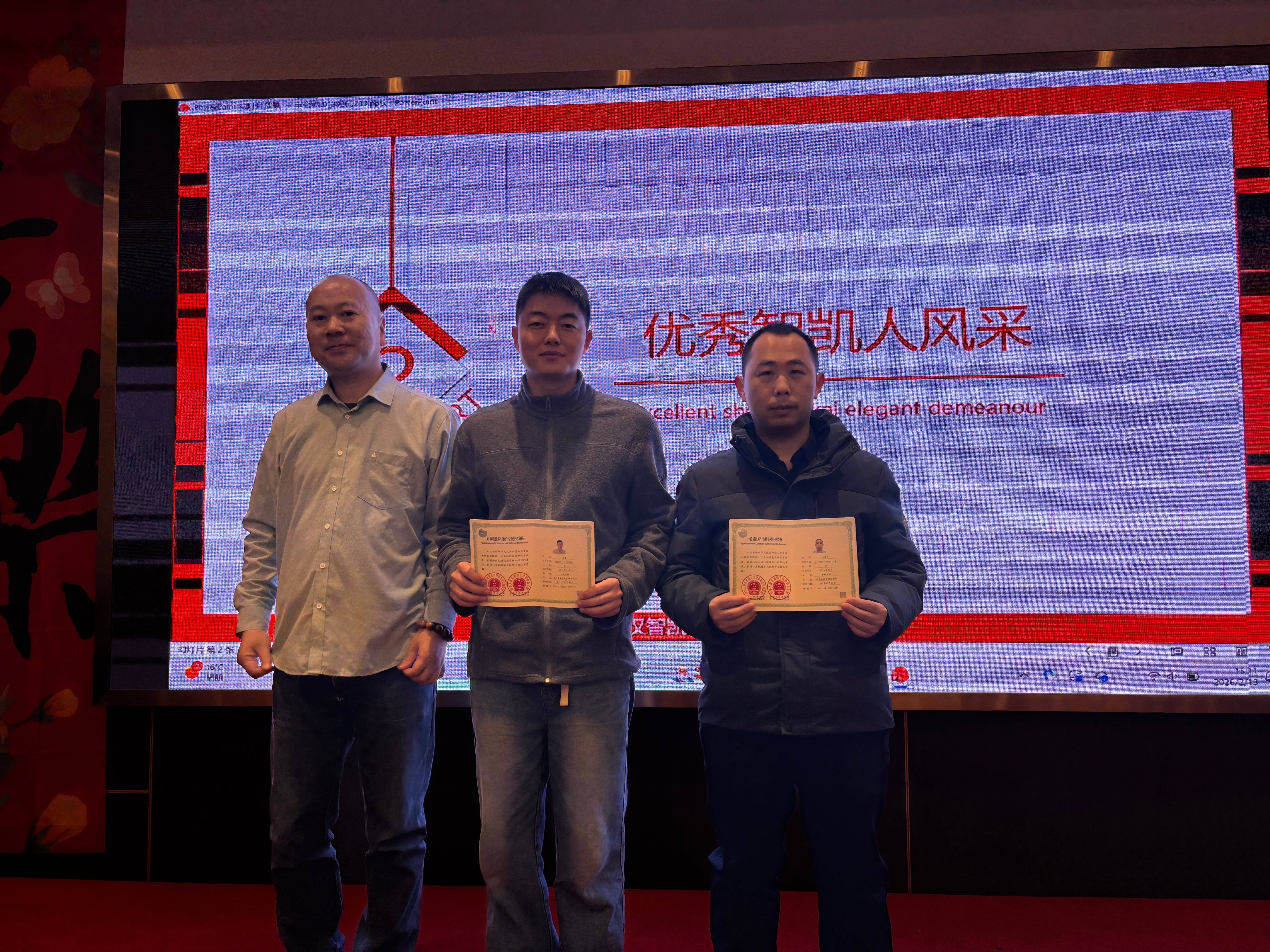本次年会特设颁奖环节。过去一年,公司大力支持员工职称申报工作,通过组织专项培训、开展政策精准解读等举措,全方位助力员工提升专业技能、锤炼职业素养。年会现场,公司领导为顺利通过职称评审的员工隆重颁奖,表彰他们在专业领域取得的亮眼成就与突出贡献。这一环节,既充分彰显了公司对员工个人职业发展的高度重视与悉心培育,更有效激励全体员工深耕专业、精进自我,为公司高质量发展持续注入专业动能与人才活力。