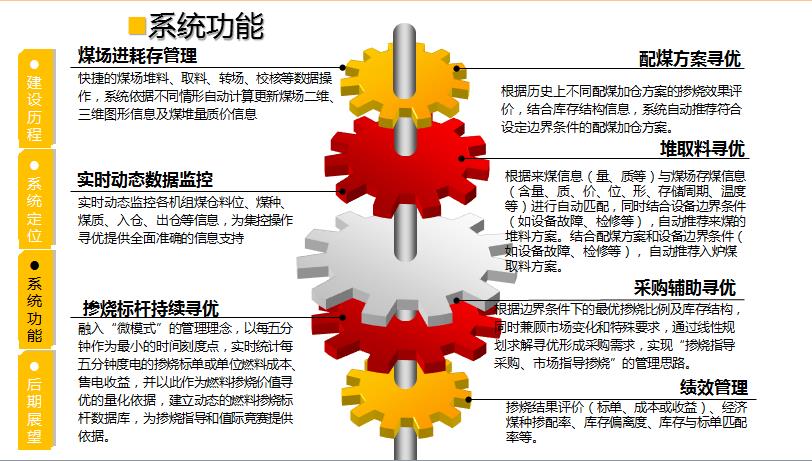 (1)[系统记录当前烧的什么煤,价格多少] 实时采集计量卸煤数据并自动归类汇总存放到相应煤场区域;实现快捷的煤场堆料、取料、转场、校核,自动计算更新煤场二维、三维图形信息及煤堆量质价信息;